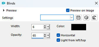 Pinte a seleção com a cor do background 7. Effects / Texture Effects / Blinds: 6 / 65 / Cor Preta / Horizontal e Light from left/top marcados