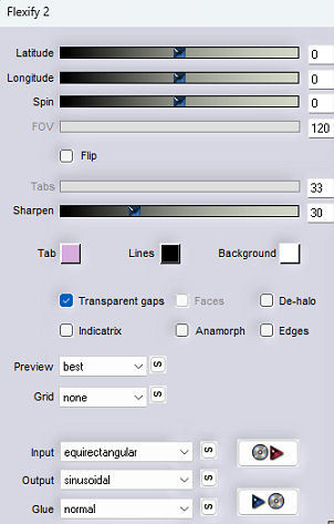 8. Selections / Select None Effects / 3D Effects / Drop Shadow: 0 / 0 / 60 / 25. Cor Preta 9. Layers / Duplicate. Effects / Plugins / Flaming Pear / Flexify 2 / Input equirectangular / Output sinusoidal / restante sem alterações